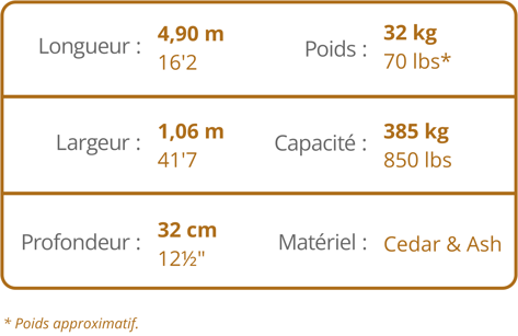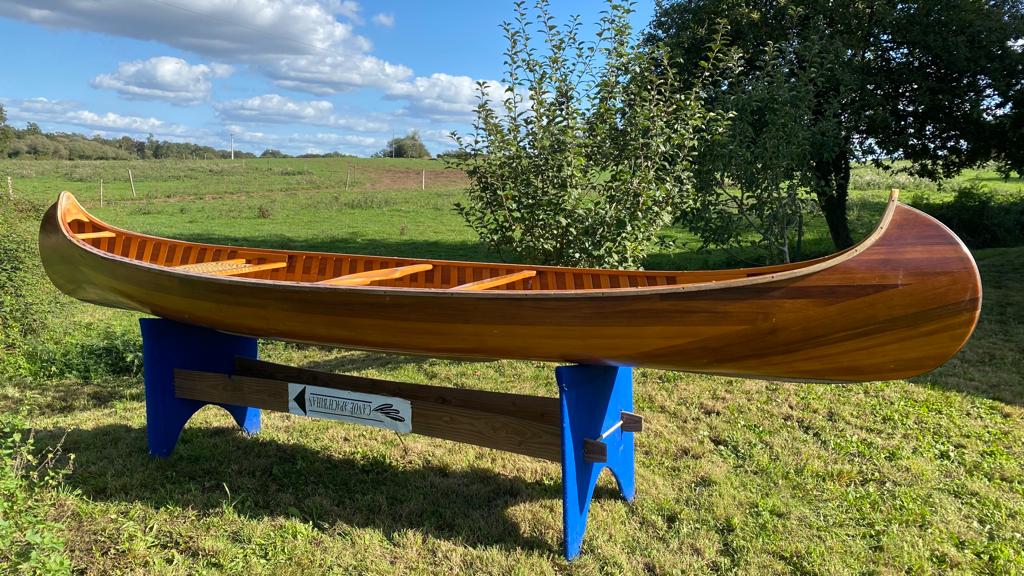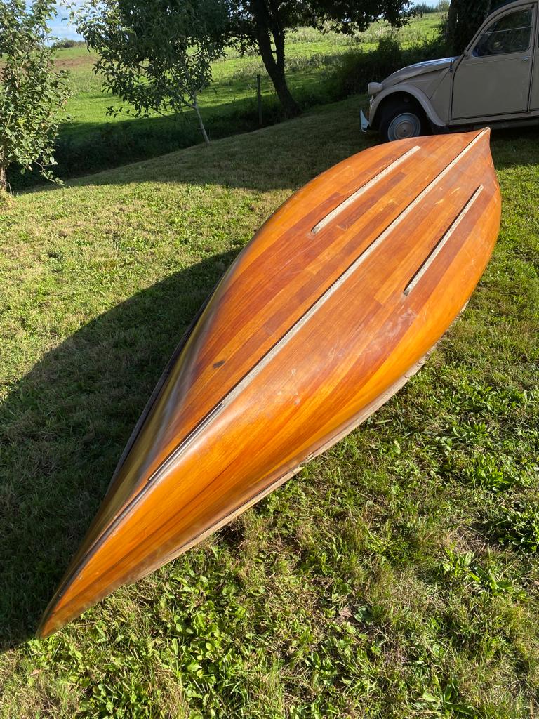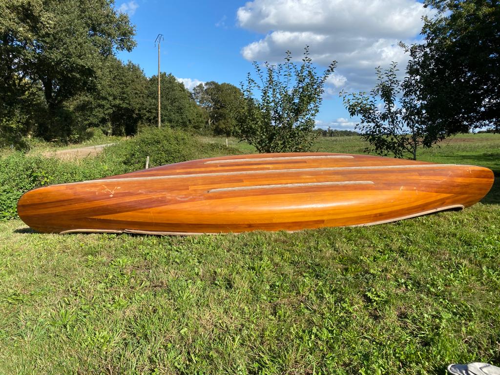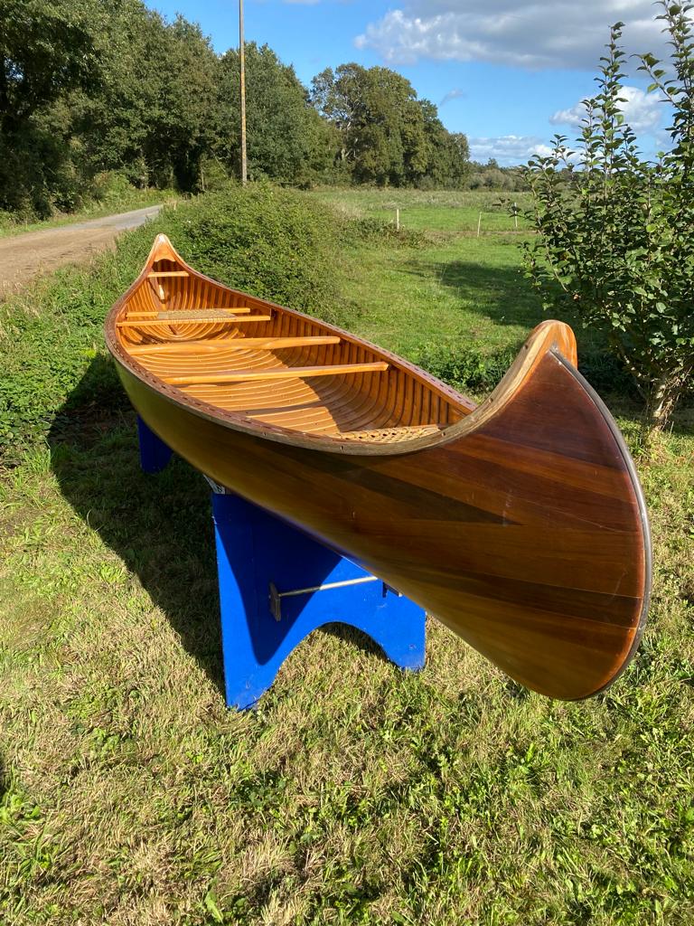 C'est un canot magnifique, une pièce rare, en cèdre rouge et pièces de frêne + fibre de verre et résine époxy.